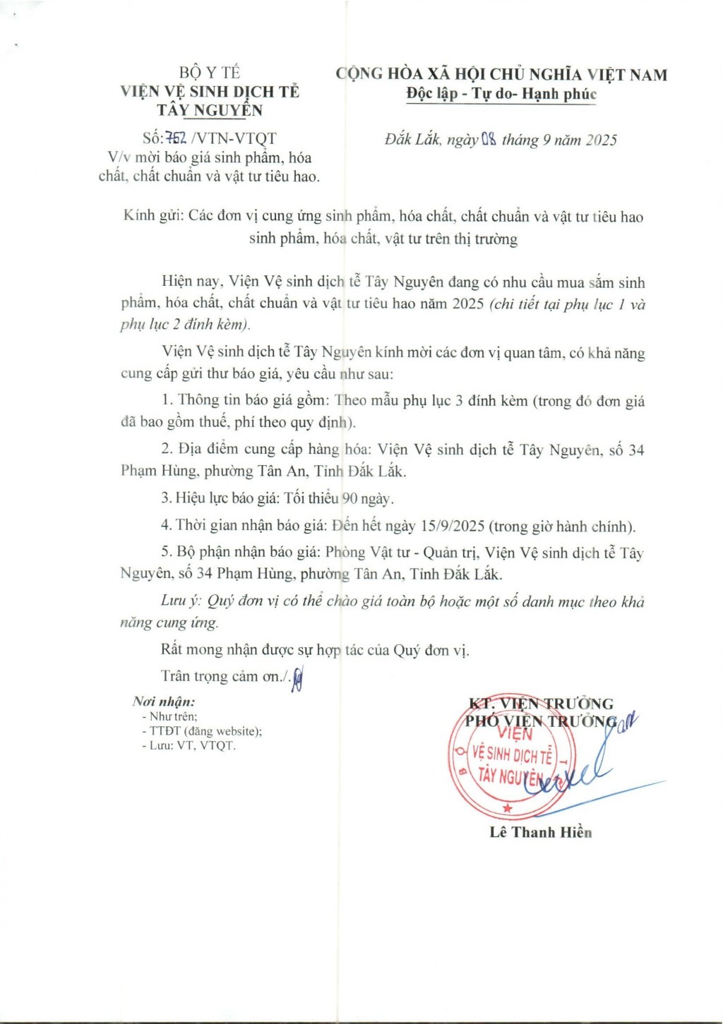 Đăng ngày: 09/09/2025Hiện nay, Viện Vệ sinh dịch tễ Tây Nguyên đang có nhu cầu mua sắm sinh phẩm, hóa chất, chất chuẩn và vật tư tiêu hao năm 2025.