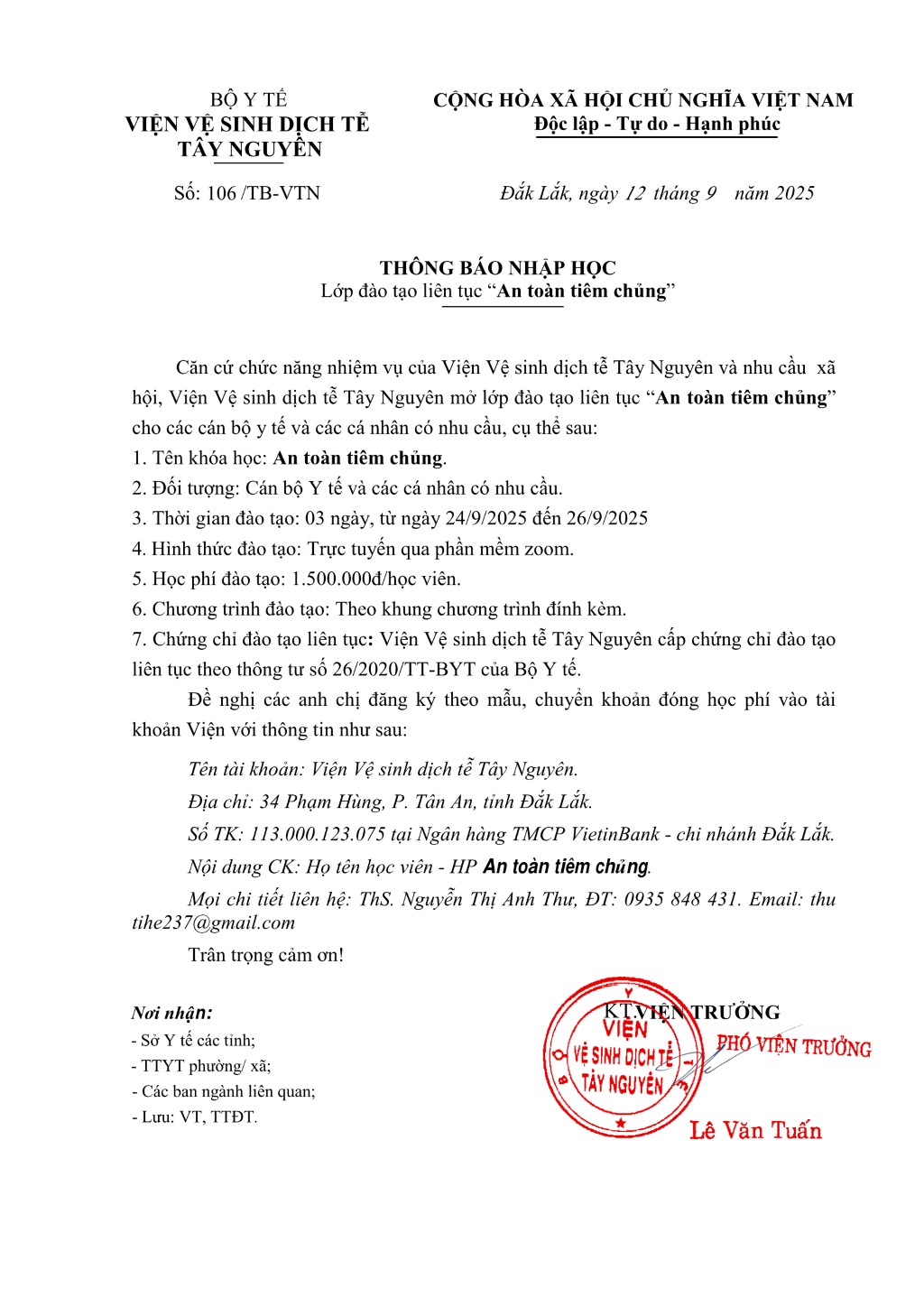 Đăng ngày: 16/09/2025Căn cứ chức năng nhiệm vụ của Viện Vệ sinh dịch tễ Tây Nguyên và nhu cầu xã hội, Viện Vệ sinh dịch tễ Tây Nguyên mở lớp đào tạo liên tục về “An toàn tiêm chủng” cho các cán bộ y tế và các cá nhân có nhu cầu, cụ thể như sau:
