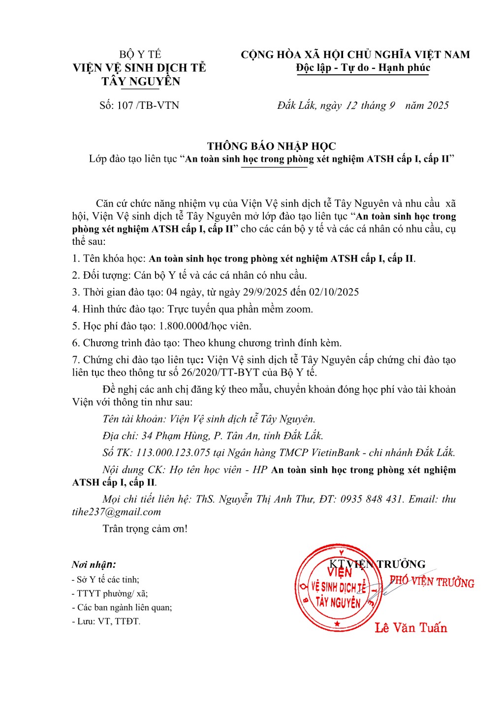 Đăng ngày: 16/09/2025Căn cứ chức năng nhiệm vụ của Viện Vệ sinh dịch tễ Tây Nguyên và nhu cầu xã hội, Viện Vệ sinh dịch tễ Tây Nguyên mở lớp đào tạo “An toàn sinh học trong phòng xét nghiệm an toàn sinh học cấp I, cấp II” cho các cán bộ y tế và các cá nhân có nhu cầu, cụ thể như sau: