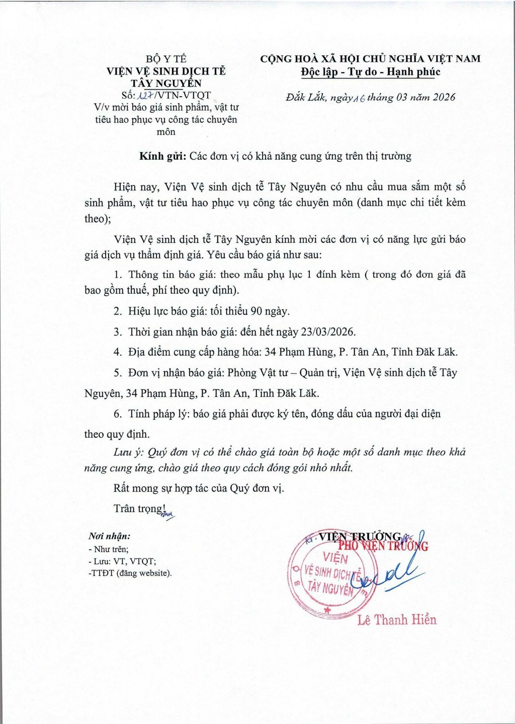 Thư mời báo giá sinh phẩm, vật tư tiêu hao phục vụ công tác chuyên môn