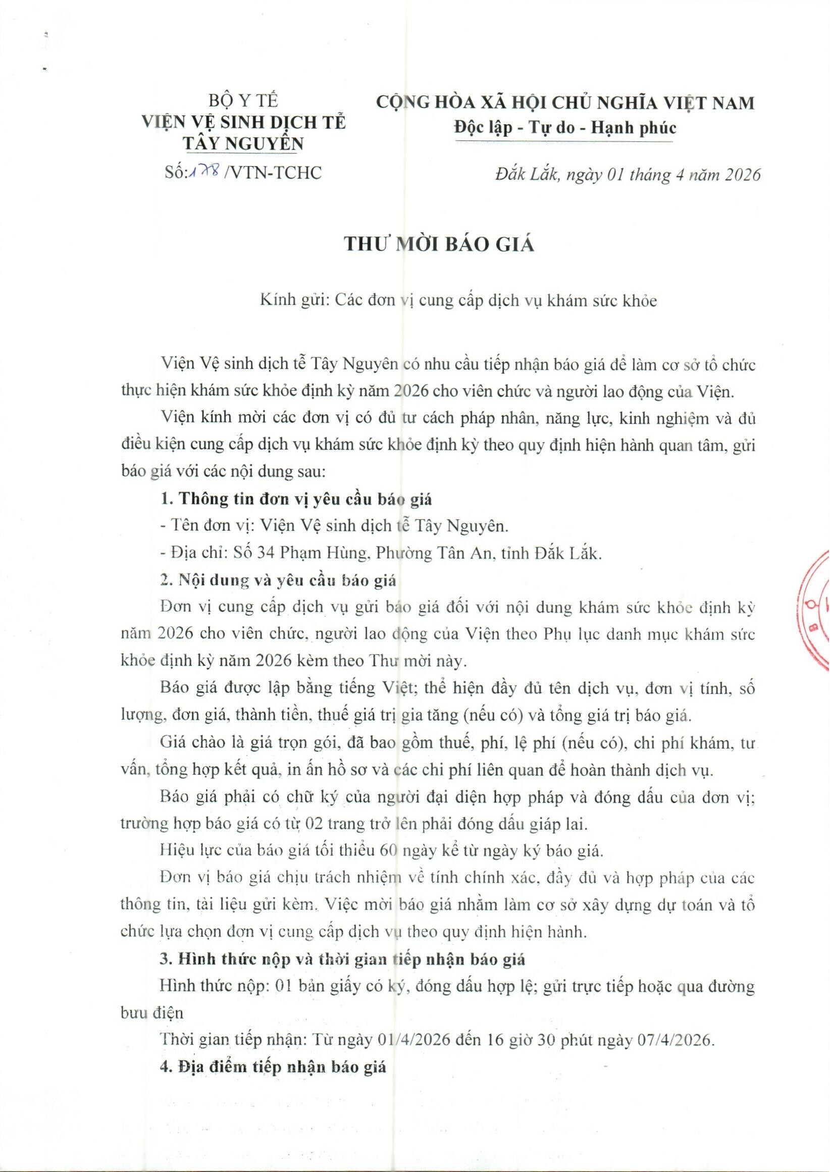 Đăng ngày: 02/04/2026Thư mời báo giá khám sức khỏe định kỳ năm 2026